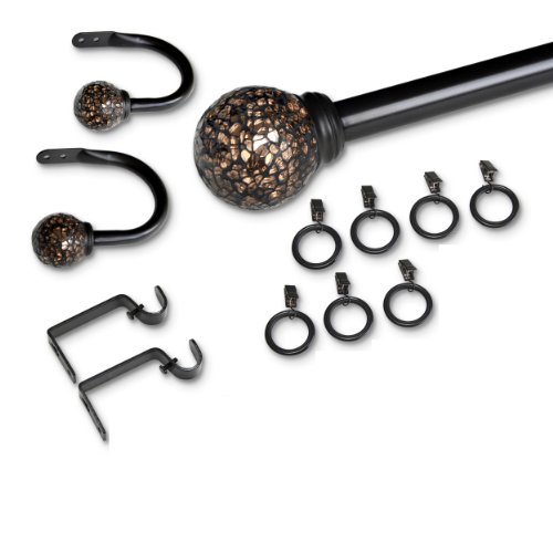 - Set includes one 28-inch to 48-inch telescopic rod, two finials, two pieces of steel support brackets, screws, the dry wall inserts to mount the brackets, seven matching rings, and two holdbacks